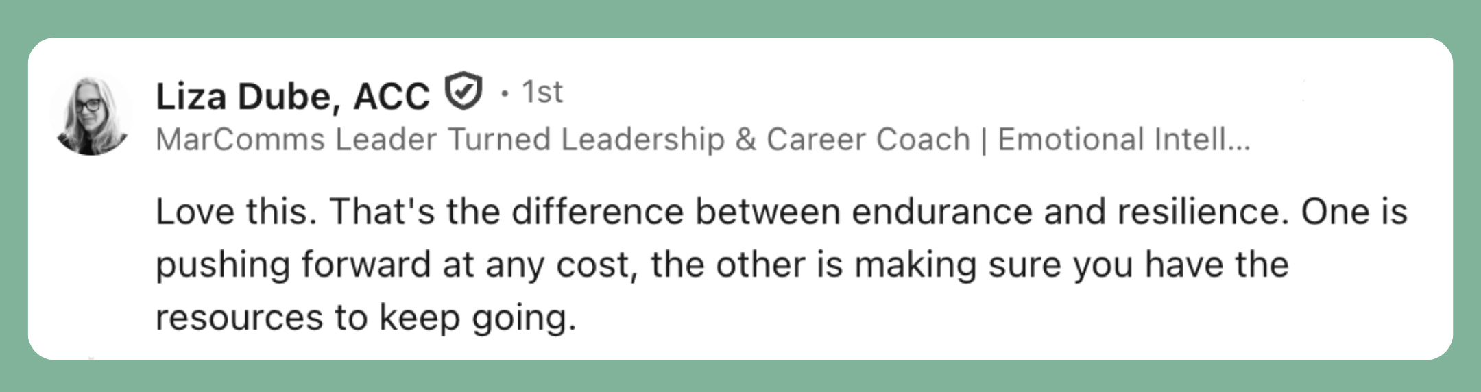 Iād never really thought about the difference between endurance and resilience, but once I saw it, I couldnāt unsee it. Talk about a lightbulb moment! (Thank you, Liza!)